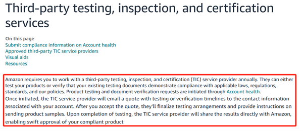 Testing or verification must be conducted through TIC agencies approved by Amazon |