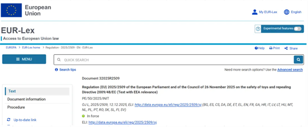 2025年12月12日,欧盟官方公报(OJ)发布了玩具安全法规(EU) 2025/2509(TSR),新规于2026年1月1日生效,并将于2030年8月1日全面实施。届时,玩具指令2009/48/EC(TSD)将同步废止。