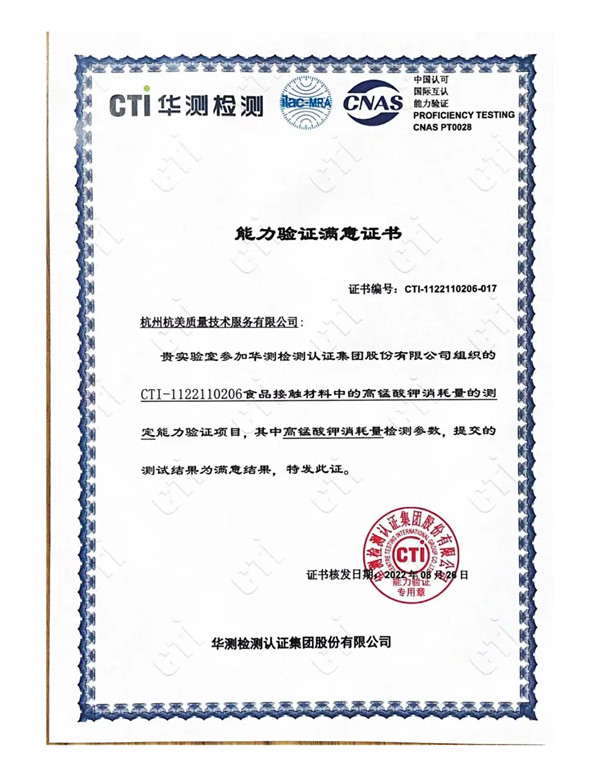 参加能力验证工作是评价实验室检验检测能力的有效措施,可以不断完善实验室的管理,提高检验检测人员的技术水平,从而获得准确、可靠的检验检测数据。此次能力验证顺利通过表明中杭美检测(HQTS-QAI)的检测能力得到保证,杭美检测(HQTS-QAI)将继续秉持“诚信、专业、灵活、快速”的方针,进一步提高检测技术能力,为社会提供满意可靠的服务。